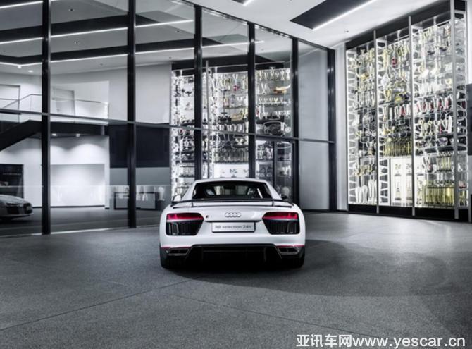 R8 Selection 24h分別在前下巴、尾翼、后擴(kuò)散器以及后視鏡蓋采用高光澤碳纖維材質(zhì)。輪圈則換上黑色涂裝Y字10幅式20吋鍛造鋁合金輪圈。