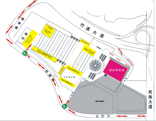2、展館停車區(qū):持有會展中心發(fā)放的臨時通行證車輛可從民族大道或越秀路進入會展路,分別從3號口或5號口進展館停車區(qū)。