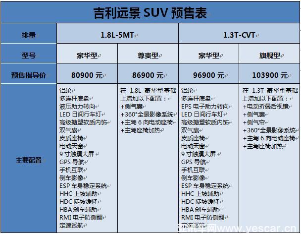 通過上表能夠看出,遠景SUV搭載全新“1.3T+CVT”高效動力組合,以及“1.8L+5MT”經(jīng)濟動力組合。此次預售的4款車型全部標配了ESP車身穩(wěn)定系統(tǒng)、上坡輔助、陡坡緩降、剎車輔助、電子防側(cè)翻、LED日間行車燈、雙氣囊、GPS導航、9寸觸摸大屏、倒車影像、手機互聯(lián)、定速巡航等智能科技配置。1.8L尊貴型增加360°全景影像系統(tǒng)、主駕6向電動座椅、主駕座椅加熱、側(cè)氣囊等。而1.3T旗艦型在此基礎上還增加側(cè)氣簾以及電動折疊后視鏡等配置。此外,前麥弗遜式、后多連桿獨立懸架底盤系統(tǒng)經(jīng)過調(diào)校與優(yōu)化,為用戶帶來舒適、穩(wěn)定、安全的操控和乘坐體驗。