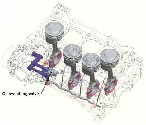 此外,豐田首次采用了對(duì)活塞冷卻的機(jī)油噴射停止系統(tǒng),該系統(tǒng)具有電子控制式切換閥,可依據(jù)發(fā)動(dòng)機(jī)冷卻液溫度、發(fā)動(dòng)機(jī)轉(zhuǎn)速、負(fù)荷等,對(duì)機(jī)油噴射進(jìn)行控制,可以降低機(jī)油的過度消耗與稀釋。另外,這套系統(tǒng)也可降低發(fā)動(dòng)機(jī)熱機(jī)時(shí)活塞冠面的積碳堆積,而積碳的減少可為抑制低速早燃做貢獻(xiàn)。