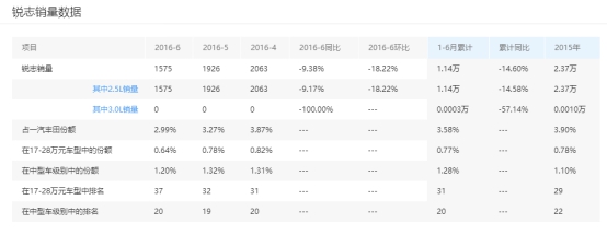 據(jù)搜狐汽車豐田銳志銷量數(shù)據(jù)來看:2015年一汽豐田銳志全年銷量為2.37萬臺,占一汽豐田全年銷售總量的3.9%,在中級車型排名中位居22名。2016年1-6月累計銷售1.14萬量,占一汽豐田全年銷售總量的3.58%,在中級車型排名20名。種種數(shù)據(jù)顯示,一汽豐田銳志車型,并不算一款量銷車,甚至比那種全年動輒銷售接近10萬的車型,顯得落寞和凄慘。