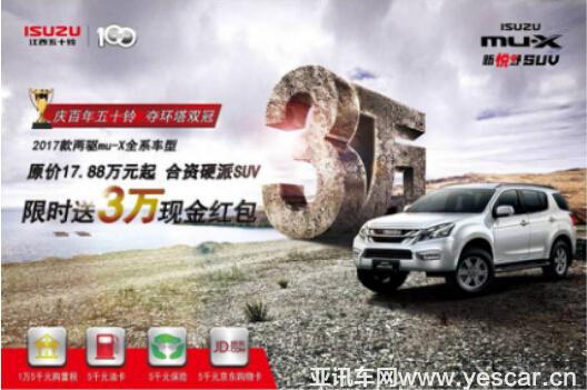 為慶祝五十鈴一百年以及mu-X環(huán)塔奪冠,也讓更多消費(fèi)者早日實(shí)現(xiàn)擁有mu-X的夢(mèng)想,江西五十鈴將為購車者提供2017款mu-X兩驅(qū)全系車型大優(yōu)惠,包括免15000元購置稅、贈(zèng)送5000元保險(xiǎn)、5000元油卡、5000元京東購物卡,相當(dāng)于只花14.88萬元即可將mu-X開回家。本次優(yōu)惠活動(dòng)讓mu-X的價(jià)格直指15萬元SUV市場(chǎng),是mu-X的開疆拓土之舉,勢(shì)必在廣大消費(fèi)者群體中掀起搶購風(fēng)潮。