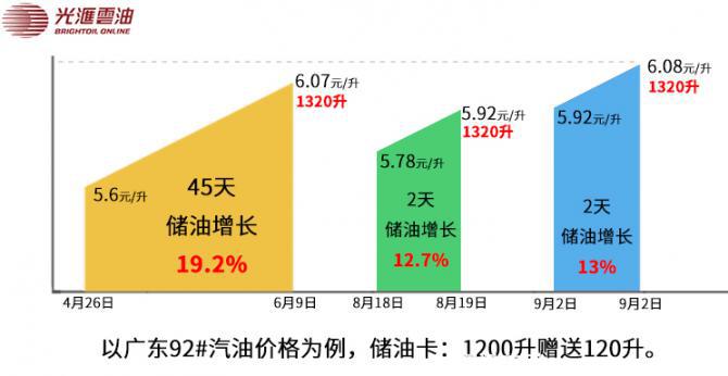 按照光匯云油平臺推出的線上儲油產(chǎn)品政策,額外獲贈最高10%的油品,如1200升送120升,13000升送400升,折合目前廣東92#油價6.08元/升,贈送價值高達2432元。