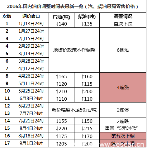 2016年國內(nèi)成品油調(diào)價經(jīng)歷了6漲3跌共9次調(diào)整,6次因地板價政策不調(diào)整,2次因未達調(diào)價紅線擱淺,大體趨勢是漲得多,跌得少。因中秋節(jié)假期的影響,下一輪調(diào)價窗口將在2016年9月18日24時開啟。