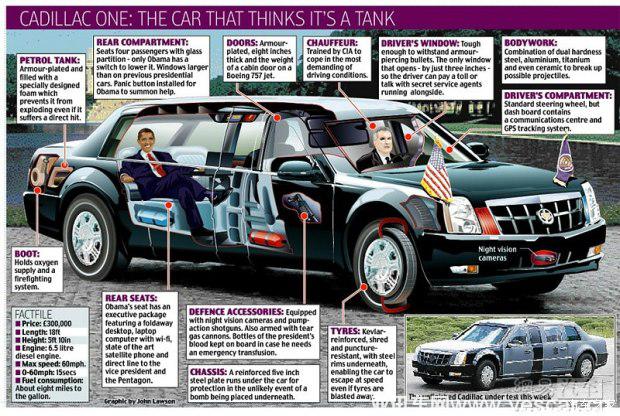 跟隨奧巴馬總統(tǒng)周游列國的專用座駕“陸軍一號”是一輛代號為Beast(野獸)的凱迪拉克防彈車。這輛由凱迪拉克改裝而來的專用座駕號稱是世界上最安全的汽車,它也僅僅只是長著汽車樣子,事實上是裝甲車。駕駛艙玻璃厚度達到了3英寸(約7.6厘米),而后方總統(tǒng)乘坐的座艙防彈鋼板厚度達到了8英寸,僅車門的重量就堪比波音飛機的艙門,車身的每一個位置都進行了強化,安全性能非常高。