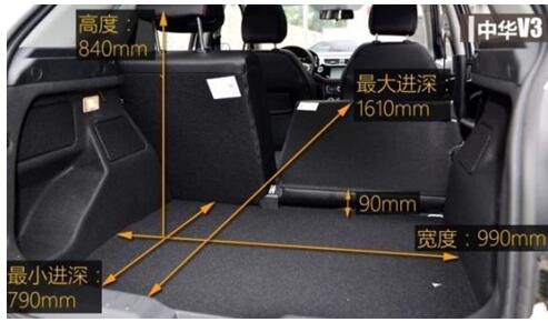 中華V3后備廂寬990mm、高840mm,最小進深790mm,最大進深1610mm,容積為400L,與紳寶X35相比,兩者的后備廂容積相當(dāng)。但是在車身的長寬高相差較多的情況下,后備廂占用空間直接會影響到前后排乘坐空間的舒適度。明顯可以看到,紳寶X35在乘坐空間和后備廂的容積上,更具優(yōu)勢。