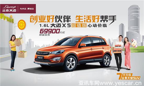 2016年9月28日,眾泰大邁X5超值版正式上市,推出舒適型和時尚型共兩款車型,售價分別為6.99萬元和7.59萬元。如果你的預(yù)算較低,買它準(zhǔn)沒錯,6萬多就能買到一輛性價比高、顏值高、實用性高的緊湊型SUV,7萬多就能買到帶有可開啟全景天窗,還能夠滿足外出旅游、工作拉貨等多種需求,生活工作兩不誤,更有各種金融政策提供,讓你無憂購車。