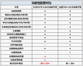兩款車(chē)在配置方面沒(méi)有拉開(kāi)太大差距,寶駿730增加了GPS系統(tǒng)與后視鏡加熱的功能配置。長(zhǎng)安CX70卻多了后視鏡電動(dòng)折疊、前泊車(chē)?yán)走_(dá)、以及右側(cè)全景影像,在駕駛中可獲得更多的路面信息,實(shí)用性更強(qiáng)。