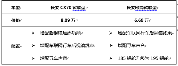 長安CX70智聯(lián)型在手動豪華型車型的配置基礎上增加了后視鏡加熱的功能,提升寒冷條件下的可視度和安全度;車聯(lián)網行車后視鏡線束,用原車線束進行配置,讓消費者隨時便捷的掌控車內狀況;尋車聲音增加,在密集的車流中發(fā)現(xiàn)自己愛車,更節(jié)省時間。