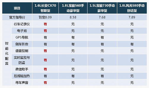 以1.6L長安CX70智聯(lián)型(簡稱長安CX70智聯(lián)型)為例,相比同級競品1.8L寶駿560手動豪華型、1.5L寶駿730手動豪華型和1.8L風光580手動舒適型,多了行車記錄儀、電子狗、語音控制、實時監(jiān)控與防盜、微信助手、尋車聲音,配置優(yōu)勢明顯,。