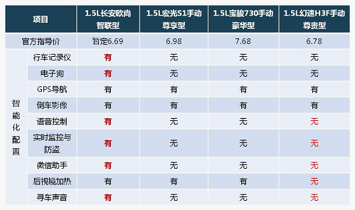 而1.5L長安歐尚智聯(lián)型(簡稱長安歐尚智聯(lián)型)的主要競品有1.5L宏光S1手動尊享型、1.5L寶駿730手動豪華型、1.5L幻速H3F手動尊貴型。長安歐尚智聯(lián)型在配置和性價比方面也以完勝之態(tài)碾壓對手。