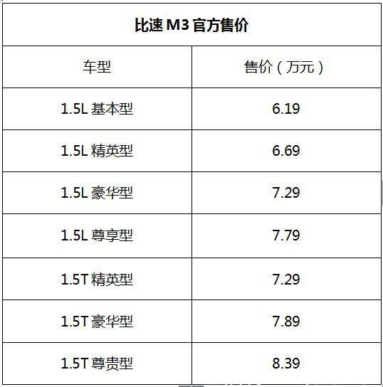比速M3共公布7款車型,官方售價6.19萬元—8.39萬元。