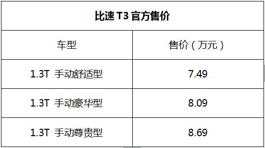 比速T3作為“動感高效能精品SUV”主要針對都市年輕群體設(shè)計。官方售價7.49萬元—— 8.69萬元。
