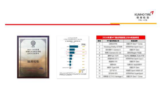 國內外各大獎項對錦湖輪胎的青睞,充分證明了專業(yè)領域對錦湖輪胎的肯定,同時也是錦湖輪胎多年來用高品質的產(chǎn)品實踐證明的實力所示。贊助專業(yè)的汽車賽事即是驗證輪胎品質的重要途徑,對塑造品牌的專業(yè)形象有著不可磨滅的促進作用。因此錦湖輪胎與CTCC中國房車錦標賽、FIA F4中國中國錦標賽、Auto GP、德國VLN耐力賽、Super Race等國內外知名汽車賽事都開展了長久而深入的合作。作為中國房車錦標賽CTCC和FIA F4中國方程式錦標賽的指定輪胎供應商,2016年,錦湖輪胎干地胎ECSTA S700和濕地胎ECSTA W700伴隨CTCC走過了8站比賽,見證FIA F4的5地的激烈爭奪。從北方的金港賽場到華東的F1賽場,從南方的肇慶賽場到西南的貴陽賽場,錦湖的輪胎不僅經(jīng)受住了賽車手們的極速考驗,也經(jīng)受住了中國各地不同地貌、溫度、濕度的考驗,成為CTCC和FIA F4行走中國最合適的“跑鞋”,對于賽事繁榮作出了難以磨滅的貢獻,也因此分別獲得了CTCC年度最佳貢獻獎和FIA F4年度突出貢獻獎。
