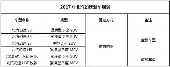 在銷量穩(wěn)步增長的情況下,北汽幻速也對2017年有了新的期待。據(jù)悉,2017年北汽幻速將在保持“雙V”戰(zhàn)略的基礎(chǔ)上,繼續(xù)以用戶需求為導(dǎo)向擴(kuò)充產(chǎn)品陣營,并爭取新的細(xì)分市場,加快產(chǎn)品向上升級。2017年,北汽幻速將陸續(xù)推出4款新車和2款改款車,全新車型包括緊湊型5座SUV幻速S5、緊湊型7座SUV幻速S4、中型7座SUV幻速S7和緊湊型MPV幻速H5;改款車型為2018款幻速S6和H3F改款車。