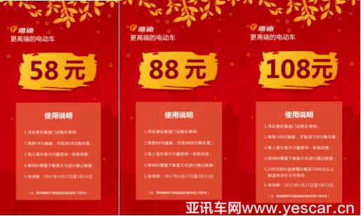 活動期間,將有10萬張雅迪電動車代金券限時發(fā)放,包括5萬張58元、3萬張88元和2萬張108元三種面額。代金券共計價值720萬元,在3月31日之前均可使用。