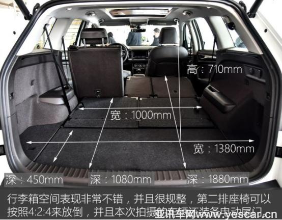 柯迪亞克的后備廂內(nèi)部造型規(guī)整,第二排座椅可以按照4/2/4比例放倒,并且中高配車型還提供電動(dòng)尾門;7座模式下柯迪亞克可以裝入一個(gè)24以及一個(gè)20英寸的行李箱,5座模式下圖中3個(gè)行李箱都裝下還富余一部分空間,所以其后備廂整體空間實(shí)用性與擴(kuò)展能力都令人滿意。
