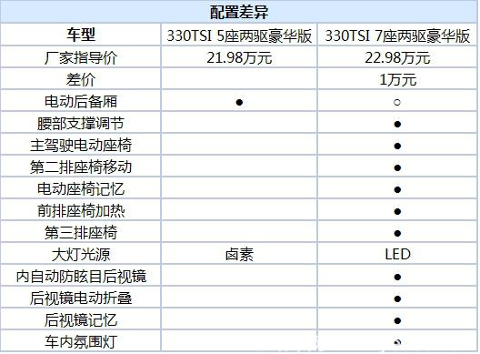 別看倆車型都叫豪華版,但并不單單只有座位布局的區(qū)別,7座豪華版車型前后排座椅都加入了更多調(diào)節(jié)功能,還有電動(dòng)折疊后視鏡、前排座椅加熱、內(nèi)自動(dòng)防眩目后視鏡等等,并且升級(jí)成了全LED光源,所以這1萬(wàn)元的差價(jià)是非常超值的,屬最值得推薦的車型。但有一點(diǎn)令人費(fèi)解,7座豪華并沒有標(biāo)配電動(dòng)后備廂,變成了選裝,哎,真是買的不如賣的精啊。