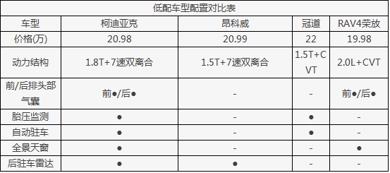 雖然柯迪亞克、昂科威、冠道同屬中級(jí)SUV車型,不過在起售價(jià)格和配置上還是拉開了距離。以柯迪亞克TSI330 5座兩驅(qū)舒適版(次低配)售價(jià)為標(biāo)準(zhǔn),20.98萬的價(jià)格已經(jīng)超過了昂科威、冠道和RAV4榮放幾款車型,其中最大的優(yōu)勢(shì)無外乎是配置,而像是安全氣囊、駐車?yán)走_(dá)這類也恰恰是不能缺失的配置。