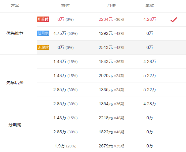 如果不想要支付尾款,還想0首付開走車,那么可以選擇0首付、0尾款、月供2500元左右、分48期還款的金融方案。這個(gè)方案適合收入穩(wěn)定的都市白領(lǐng),當(dāng)然最適合單身的朋友,無壓力購車,輕松還貸。