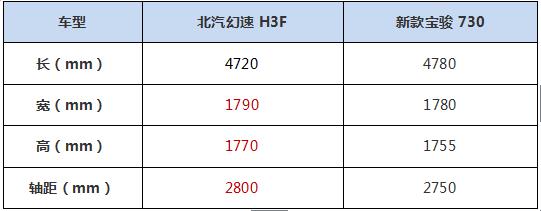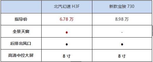 北汽幻速H3F于2016年6月上市,售價區(qū)間為5.88-6.78萬元。寶駿730是改款上市,售價區(qū)間為8.98-10.28萬元。單純比較價格,北汽幻速H3F優(yōu)勢明顯。