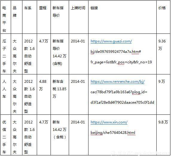 由于二手車是一車一況一價(jià),因此對(duì)于價(jià)格的判斷和制定因車而異。因此,對(duì)于買賣雙方來(lái)說(shuō)對(duì)價(jià)格的需求恰恰相反。如此以來(lái),我們從一些熱賣車型結(jié)果反推三家平臺(tái)車輛價(jià)格情況。筆者找了一款熱賣車型,大眾高爾夫,三個(gè)平臺(tái)選擇了品牌、車系、里程、上牌時(shí)間相近的三臺(tái)車做了比較,如下圖: