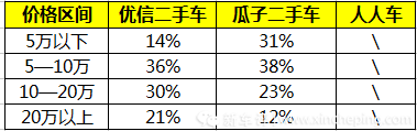 由于人人車頁(yè)面上沒(méi)有具體車源數(shù)據(jù),因此不計(jì)入統(tǒng)計(jì),只對(duì)比優(yōu)信二手車及瓜子二手車。從統(tǒng)計(jì)結(jié)果來(lái)看,5—10萬(wàn)價(jià)格區(qū)間的車輛在瓜子二手車平臺(tái)上占比最高達(dá)38%;同價(jià)格區(qū)間在優(yōu)信二手車上的占比為35%。0-5萬(wàn)以下的車輛在瓜子平臺(tái)上的占比為31%,而同價(jià)格區(qū)間車輛在優(yōu)信的占比僅為14%。此外,在10—20萬(wàn)及20萬(wàn)以上的價(jià)格區(qū)間段車輛,優(yōu)信平臺(tái)車輛占比均高于瓜子。