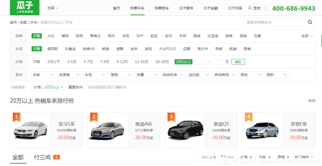 瓜子二手車頁(yè)面布局簡(jiǎn)潔利落,可以很清晰的找到買車和賣車兩個(gè)版塊。其中,買車版塊將熱門(mén)價(jià)格區(qū)間、和熱門(mén)關(guān)鍵詞、品牌進(jìn)行了展示,用戶可以快速進(jìn)行檢索。賣車版塊展示了目前平臺(tái)上有賣車申請(qǐng)的用戶數(shù)量,從一方面展示出平臺(tái)的車源量豐富。進(jìn)入買車二級(jí)頁(yè)面后,瓜子平臺(tái)還會(huì)針對(duì)用戶選擇進(jìn)行智能化推薦,比如選擇20萬(wàn)以上價(jià)格區(qū)間的車型,瓜子會(huì)在列表最上端提供“20萬(wàn)以上熱銷車系排行榜”,不得不說(shuō)此舉能夠很好地提升用戶體驗(yàn)。