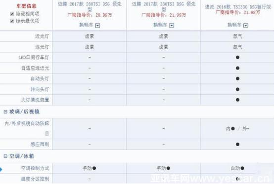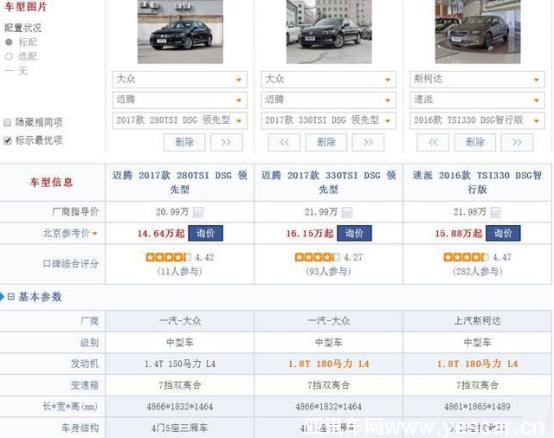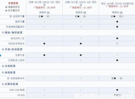 以售價(jià)21.99萬(wàn)元的邁騰 2017款 330TSI DSG 領(lǐng)先款,和售價(jià)21.98萬(wàn)元的速派 2016款 TSI330 智行版為例對(duì)比。為了更清晰的進(jìn)行比對(duì),特別增加了一款售價(jià)20.99萬(wàn)元的邁騰 2017款 280TSI DSG領(lǐng)先型。