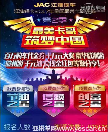 “最美卡哥,筑夢中國”第二季評選活動是由江淮輕型商用車主辦,包括節(jié)油之星、信賴之星、創(chuàng)富之星三個評選組別,活動內(nèi)容及獎品十分豐富、吸引眼球,受到了廣大卡友的熱烈歡迎。自9月1日開啟海選期,歷時共8天,目前已吸引了3700多名卡哥成功報名,并吸引了近百萬人關(guān)注,這也或?qū)⒊蔀?017年輕卡行業(yè)最為火爆的用戶評選類活動,堪稱輕卡行業(yè)營銷新標(biāo)桿。