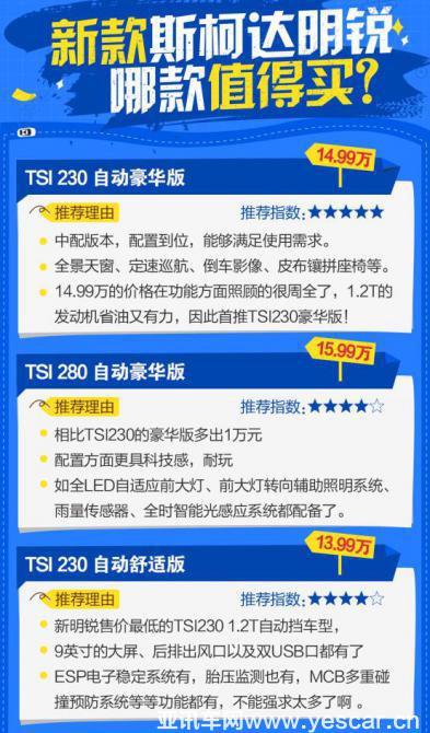 斯柯達(dá)新明銳家族的售價延續(xù)了高性價比特征,新款斯柯達(dá)明銳售價區(qū)間11.99-16.99萬元,新款明銳旅行車售價區(qū)間12.49-17.49萬元。小編認(rèn)為新明銳的豪華版最值得購買,不管是TSI230的1.2T車型還是TSI280的1.4T車型,配置都是十分的豐富到位,此次推出的7款車型也給消費(fèi)者提供了更多的選擇空間。綜合來看,新明銳是一款非常不錯的家用三廂。