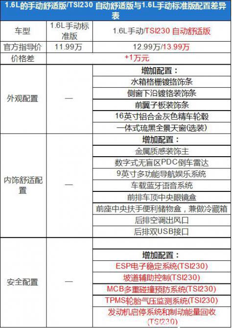 新明銳的舒適版有兩個版本,分別是1.6L車型的手動舒適版,與使用1.2T發(fā)動機(jī)的TSI230 雙離合自動擋版本。如果以相同排量的1.6L車型來做對比,舒適版比手動標(biāo)準(zhǔn)版售價多出1萬元,但是配置方面的提升其實(shí)挺明顯的,例如9英寸的大屏、后排出風(fēng)口以及雙USB充電接口,1萬塊增加的都是十分實(shí)用的配置。