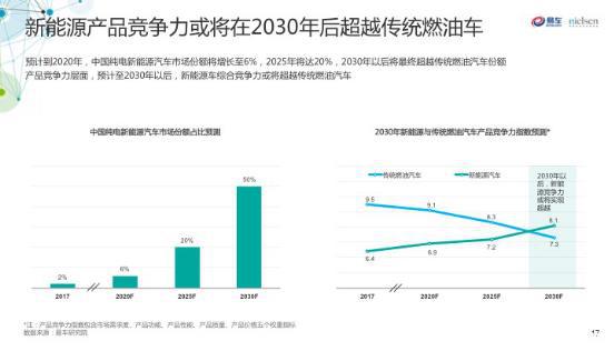 值得關(guān)注的是,《新能源汽車報告》預(yù)估新能源汽車的產(chǎn)品競爭力將在2030年超越傳統(tǒng)燃油車。其中從市場份額上來說,易車預(yù)測到2020年,中國純電動車市場份額將增長至6%,2025年將達(dá)20%,2030年將最終超越傳統(tǒng)燃油汽車份額。而從產(chǎn)品競爭力指數(shù)(包含市場需求度、產(chǎn)品功能、產(chǎn)品性能、產(chǎn)品質(zhì)量、產(chǎn)品價格五個權(quán)重指標(biāo))來說,預(yù)計到2030年,新能源汽車的綜合競爭力將超越傳統(tǒng)燃油汽車。