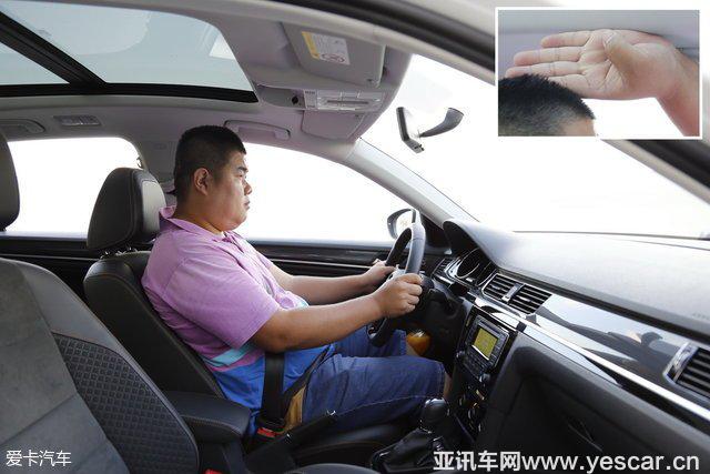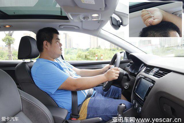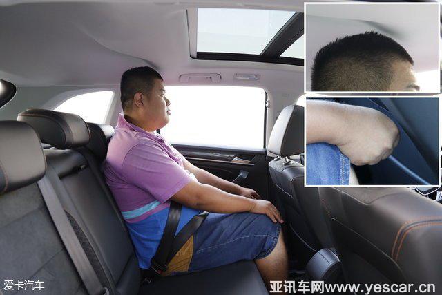 我們找來(lái)了身高175cm,體重118kg的體驗(yàn)者。坐入車(chē)內(nèi),將前排座椅調(diào)至最低,找到合適的坐姿后,頭部空間約有一拳,如果算上與全景天窗之間的空間的話(huà),那么還會(huì)有些富余。