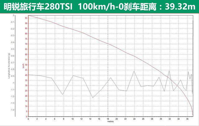 最終測(cè)得明銳旅行車(chē)TSI280車(chē)型100km-0的剎停距離為:39.32m,進(jìn)入40m大關(guān),成績(jī)非常優(yōu)秀。