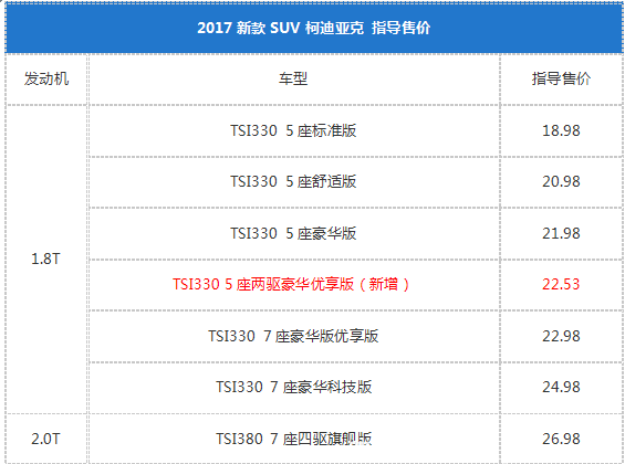 目前,斯柯達旗下的2017新款SUV柯迪亞克煥新上市,尤其是新車型的亮相更受矚目。本次新車型的最大亮點在于最新加入柯迪亞克家族的TSI330 5座兩驅(qū)豪華優(yōu)享版,其定位在TSI330 5座兩驅(qū)豪華版之上,并且針對配置進行了升級,新增車型售價為22.53萬元,詳情見下表: