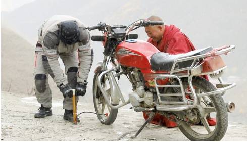 他們?nèi)_中的一臺摩托車有超過10年的車齡,主要功能正常,但前輪缺氣。了解情況后,車隊隊長左振義拿起打氣筒噌噌的為他打了個飽。