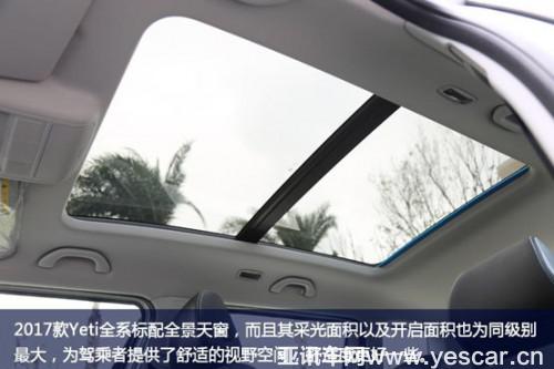 2017款Yeti還配備了消費(fèi)者喜愛的超廣角全景天窗,透光面積是普通天窗的3倍,開啟面積比普通天窗大40%,帶來更為通透的空間感。