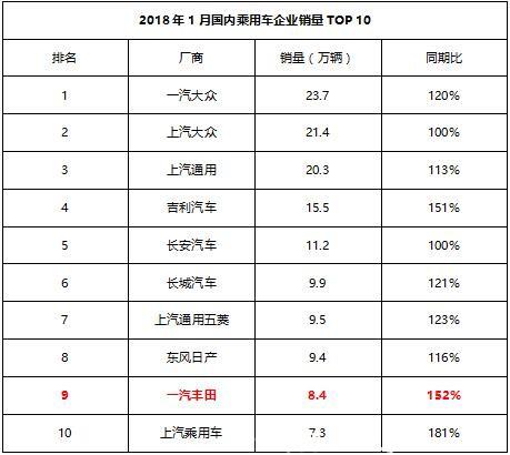 日前,2018年1月中國汽車市場銷量榜單公布,一汽豐田再傳捷報(bào),當(dāng)月其整體銷售8.4萬輛,在企業(yè)銷量排名中排在第九位,從同期比來看,前十名的企業(yè)中一汽豐田排在第二位,依舊保持著強(qiáng)勁的增長勢頭。
