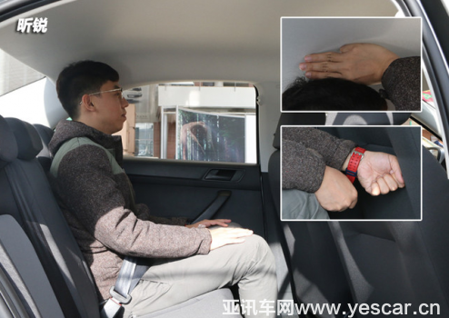 保持前排座椅位置不變,同一體驗(yàn)者來(lái)到后排,頭部剩余空間有3指,腿部則有2拳剩余空間。