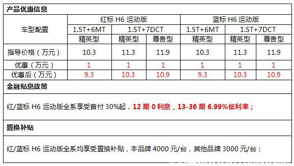 2018款哈弗H6運動版于去年底正式登陸市場,官方指導(dǎo)價為10.3萬元-11.9萬元。此次官方針對該車推出三大優(yōu)惠政策,讓消費者以更低的支出收獲冠軍品質(zhì)的產(chǎn)品。首先,哈弗H6運動版全系售價優(yōu)惠1萬元,優(yōu)惠后售價區(qū)間為9.3萬元-10.9萬元。其次,凡活動期間購買哈弗H6運動版的客戶可享受首付30%起、12期0利息和13-36期6.99%超低利率金融貼息政策。此外,凡活動期間進行車輛置換的客戶還可享受同品牌4000元/臺、其他品牌3000元/臺的置換補貼。三重厚禮,讓哈弗H6運動版更值得選購!