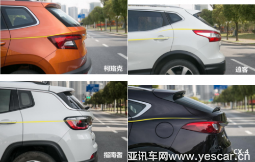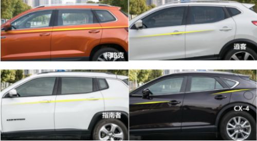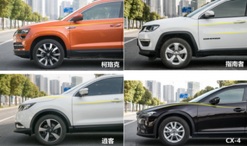 車側(cè)部分,指南者和逍客的腰線均處在門把手的水平線上,由下及上,在此設(shè)計上,后窗以及三角窗玻璃的采光量依次減少;而CX-4的腰線部分,就像上文所述前后設(shè)計斷層,前后腰線不處在同一水平線上;而四車中柯珞克的腰線處在門把手水平線之上,營造出一種SUV高大的視覺效果。