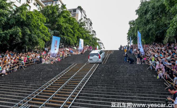 “車子爬樓梯還真的沒有見過,今天縣城里幾乎能來看的都來了?!痹诘窃铺菹旅骈_了一家超市的老板蔣先生對(duì)酷車哥說,平時(shí)自己家里人都愛爬上這個(gè)云梯去公園玩,人爬上去都要累得直喘氣?!败囎訅毫?yīng)該很大吧?”蔣老板反問。