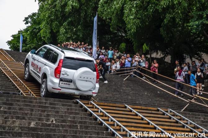 首先,臺階的輪胎接地面積相對較小,同時坡度和高度也更大,對車輛的動力扭矩輸出以及扭矩的響應是極大的考驗,稍有扭矩不足就會導致爬坡失敗,甚至有溜坡風險。其次,車輛行駛在臺階上,臺階對車輪及懸架的沖擊比其他路況都要嚴峻,其對底盤在持續(xù)惡劣工況下的高強度行駛以及零部件的可靠性有非常高的要求;尤其是在平臺上臺階,以及臺階到平臺的部位,對前后懸架的抗沖擊性是非常大的挑戰(zhàn),且萬步梯的平臺有30余個,惡劣程度可想而知。萬步梯臺階的坡度值很大,平面-斜坡-平面的過程中完全沒有過渡,這一有別于常規(guī)、并非適用于正常車輛行駛工況的路段對于車輛的通過性(接近角、離去角,縱向通過角)將是非常大的考驗,一般車輛是無法完成的。那么作為哈弗家族的旗艦車型哈弗H9又將如何以實力來應對撫平以上重重挑戰(zhàn)呢?