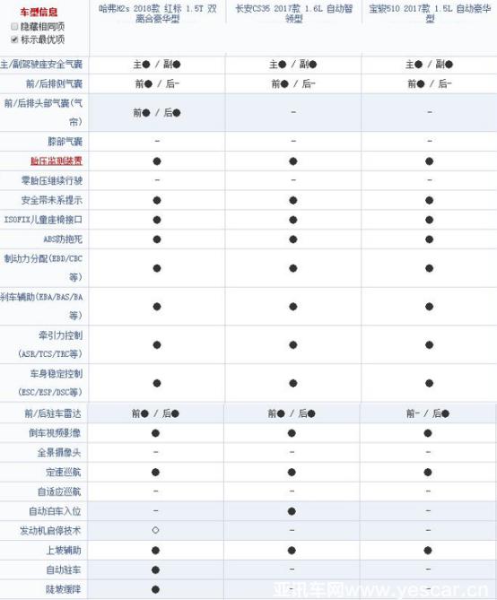 說起配置不得不提安全,哈弗H2s、長安CS35以及寶駿510都配備了側(cè)氣囊、胎壓檢測系統(tǒng)、ABS防抱死系統(tǒng)、EBD制動力分配、EBA剎車輔助、TCS牽引力控制、ESP車身穩(wěn)定系統(tǒng)等配置。