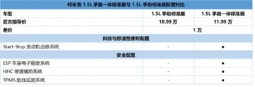 與1.5L手動標準版車型相比,柯米克1.5L手動舒適版車型增加了非常多的配置,1.1萬元的差價,除了換來一鍵啟動和全自動空調、雨量感應、定速巡航等提升駕駛便利性的配置外,最重要的是在安全配置上增加了ESP、坡道輔助系統(tǒng)以及胎壓監(jiān)測,還多出了前排側面安全氣囊以及前后貫穿式頭部安全氣簾、倒車雷達等重要的安全配置,對于不少家庭用戶來說,側氣囊以及安全氣簾這兩項配置還是非常重要的,而新增的倒車雷達則可以更好配合倒車影像系統(tǒng),極大便利了不少有停車困難癥的用戶。