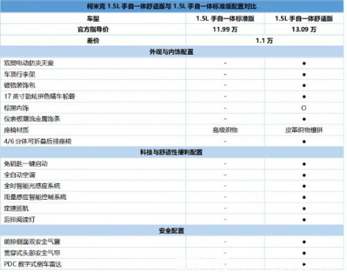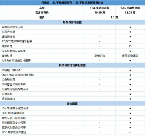 與同樣搭載6速手自一體變速箱的1.5L手自一體標準版車型相比,作為頂配車型的柯米克1.5L手自一體舒適版車型的售價只有13.09萬元,僅增加了1.1萬元的差價,但在配置上卻增加了十余項配置。首先在外觀上和手動舒適版車型一樣配備了雙層防夾電動天窗以及鍍鉻裝飾包、車頂行李架等,內飾也可選裝棕黑配色,座椅也采用織物和皮革鑲拼材質。