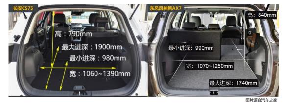 東風(fēng)風(fēng)神新AX7的后備箱容積是565L,后排座椅比例放倒后的可進(jìn)一步擴(kuò)展至1572L。而長安CS75官宣的后備箱容積是590L,最大容積可擴(kuò)展至1560L。但從實(shí)際測量數(shù)據(jù)來看,長安CS75后備箱的高度、寬度和進(jìn)深明顯不敵新AX7,平整度和通透性也不如后者。