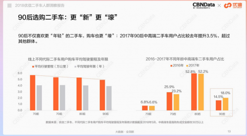 報告顯示,80后是二手車的主要購買者,依舊是主力軍,但2017年90后二手車用戶占比提升約6%,在線上汽車類產(chǎn)品購買人數(shù)及消費金額同比增速上都處于領(lǐng)先狀態(tài),整體消費市場呈現(xiàn)年輕態(tài)趨勢。