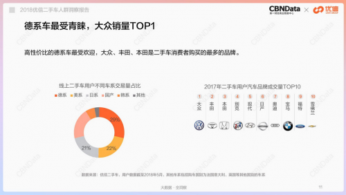 《2018二手車人群洞察報告》數(shù)據(jù)顯示,德、日、美依舊霸占汽車銷量的前三甲,共拿下72%的市場份額;高性價比的德系車最受消費者歡迎,占比達到29%。其中,大眾、豐田、本田是二手車消費者購買最多的品牌,別克、現(xiàn)代、日產(chǎn)分列四-六位。